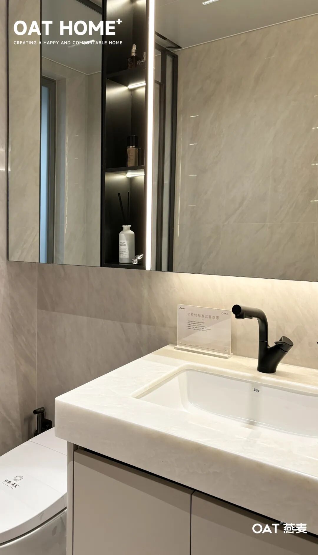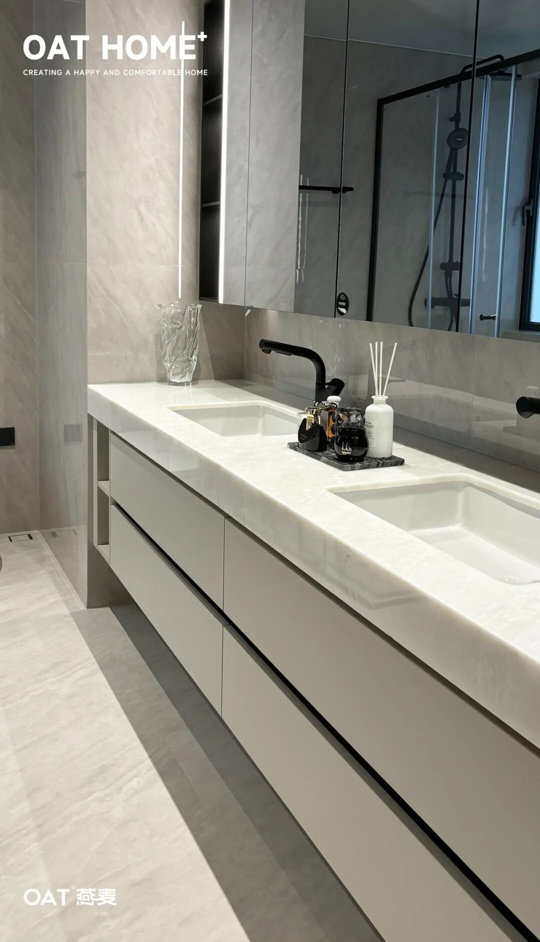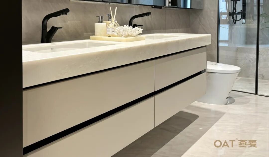 化繁为简的造型,彰显的是极致的安逸,一字排开的洗漱吊柜,以凹凸有致的纹理传达出简而不简的卫浴新理念,装饰区、置物区、洗漱区、给你不同的归置选择,立体的柜体线条加之岩纹背板的变配合,呈现出简约而有力的极致造型。