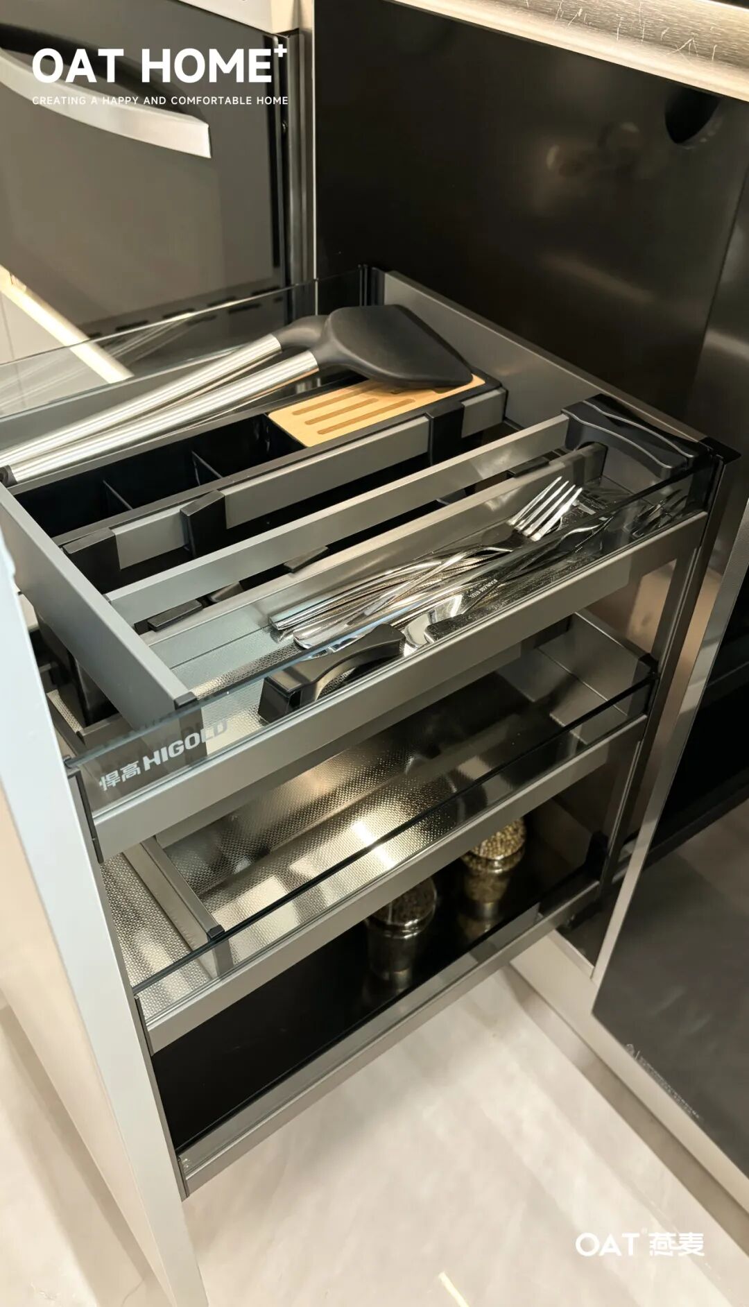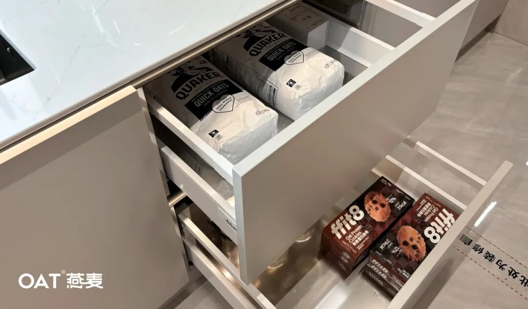 超大面积的存储拉篮,所有的碗碟、锅具收纳一步搞定,把拉篮位置设计在灶台区正下方,使用时也趁手方便。