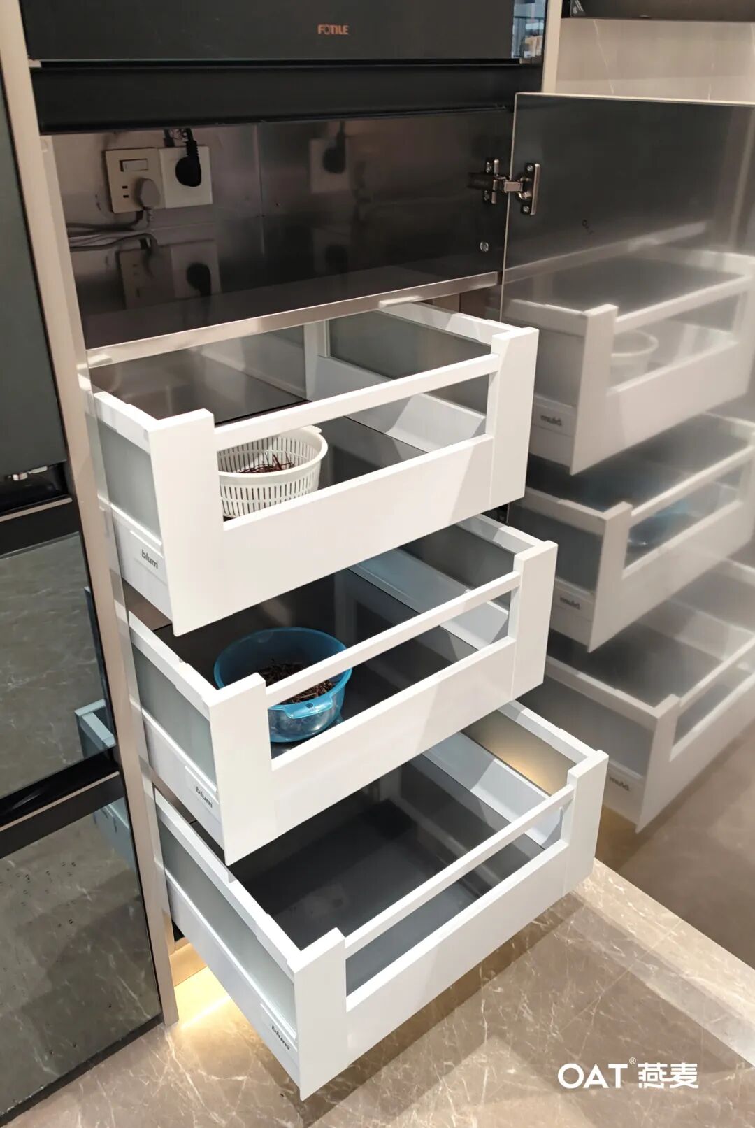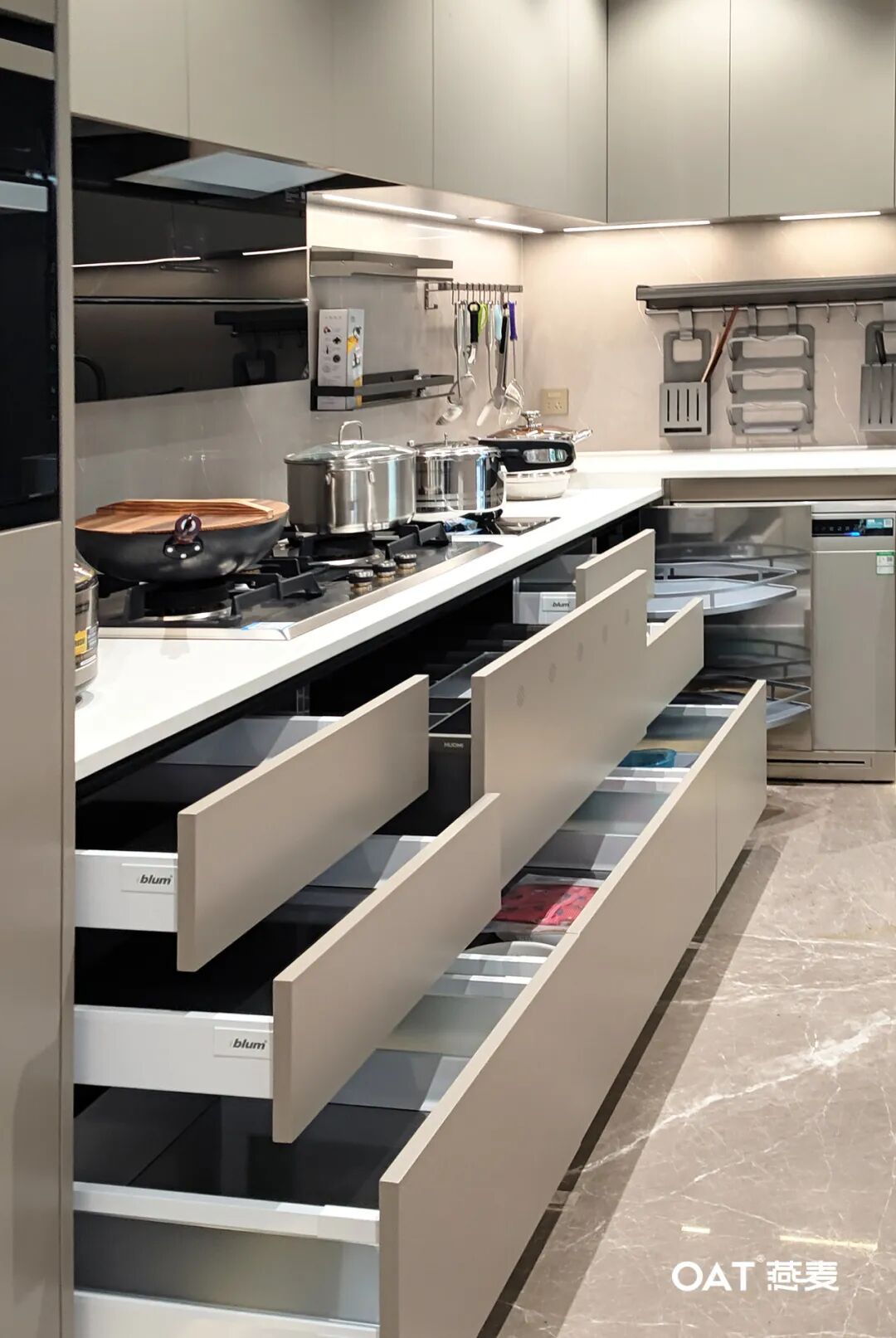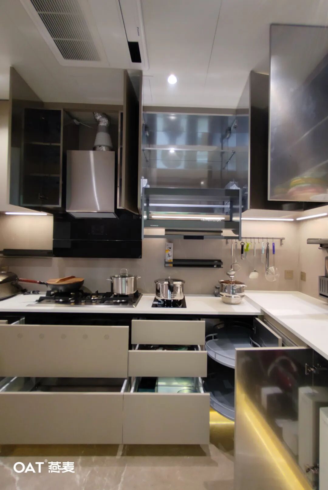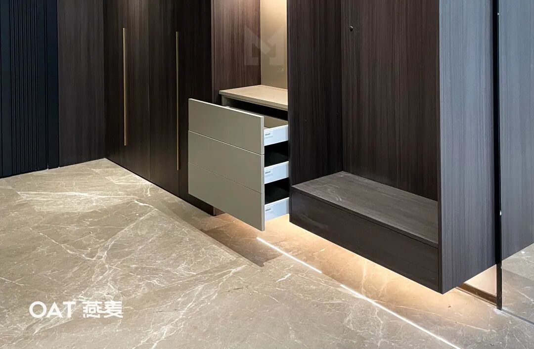 收纳系统包括了多功能的橱柜和抽屉,